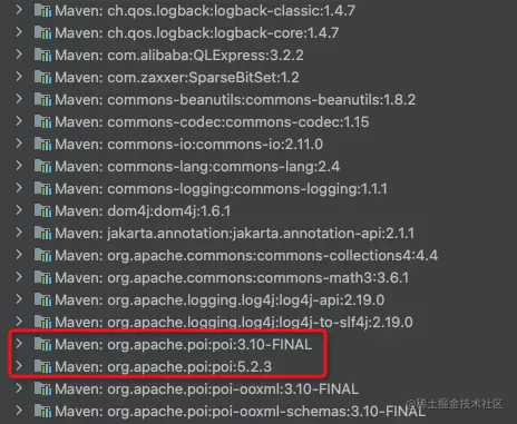 其中 poi-ooxml 依赖了包 poi ,poi-scratchpad 也依赖了 poi 包,但是 poi-ooxml 依赖了 poi 包的 3.10-FINAL 版本, poi-scratchpad 依赖了 poi 包的 3.17-beta1 版本,由于存在申明顺序优先原则,项目会使用 poi 包的 3.10-FINAL 版本