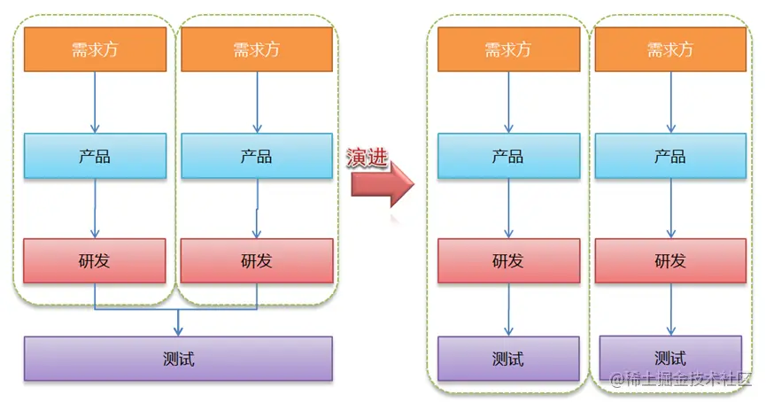 西医中“头疼医头,脚疼医脚”的思路在研发团队中往往不能奏效。中医的整体辩证论治往往是解决问题的良方。其根本还是思考维度和观察视角的不同。举个例子来说,改变人类出行方式的,并没有按照培育更加优良健壮的马匹来演进,而是自行车,汽车的发明;还有被大众经常戏说的例子,抢占方便面市场的不是因为某一款方便面,可能是外卖的兴起。这都告诉我们,从更高维度视角去审视问题,问题往往更容易被定位解决。我们先来看一下研发体系需求交付流程,涉及到的人员合作及各个交互阶段,如下图: