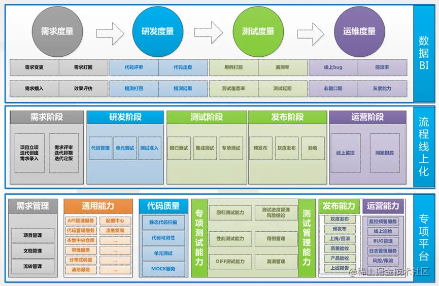 最终按照软件交付流程,将产研测运等核心节点如法炮制,最终形成体系化的解决方案,如下图: