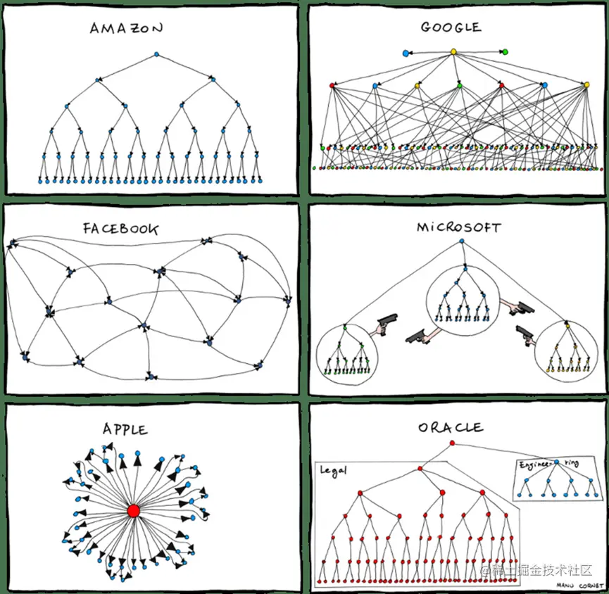 为了直观理解,我们借用一张流传甚广的图来理解一下组织结构: