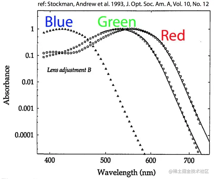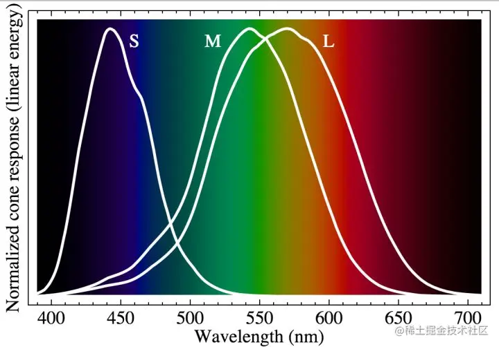而人眼对不同波长的感知能力可以用下图中的白色曲线来表示。白线对应的值越高,表示人眼对此波段的光子的感知越灵敏。人眼把S那条线感受到的光子都认知为蓝色、把M那天线的认知为绿色、把L那天线对应的认知为红色。