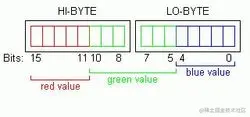 如RGB565彩色模式, 一个像素占两个字节, 其中: