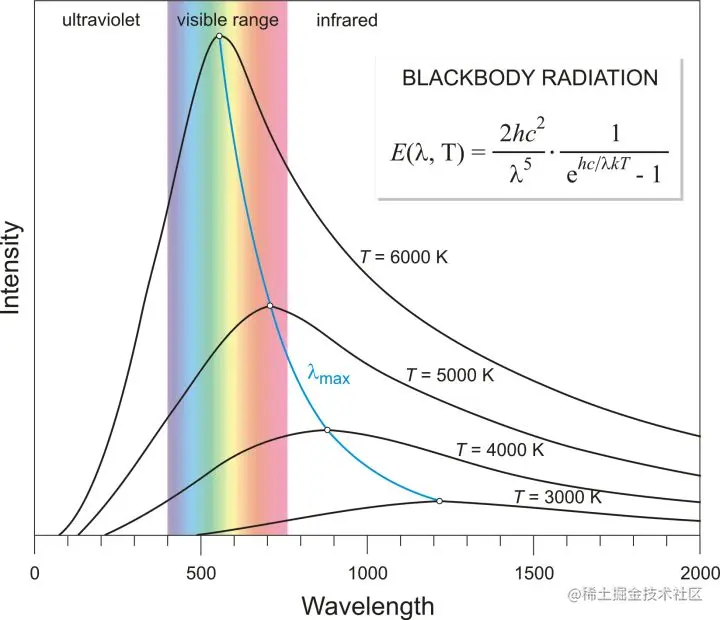 而,通过数学运算,不难算出真实光谱,比如450nm的光应该什么颜色的。你只需要把450nm处三种颜色的视锥细胞的响应叠加起来就行了。通过这样的方法,你就可以计算出一条曲线,它可以近似代表自然界中真实的色彩。此外,你还可以计算出色温曲线。如果你还记得黑体这个概念的话,不同温度会给出不同的能谱分布,如下图,不同的能谱分布中,蓝、绿和红色的相对强度不同。