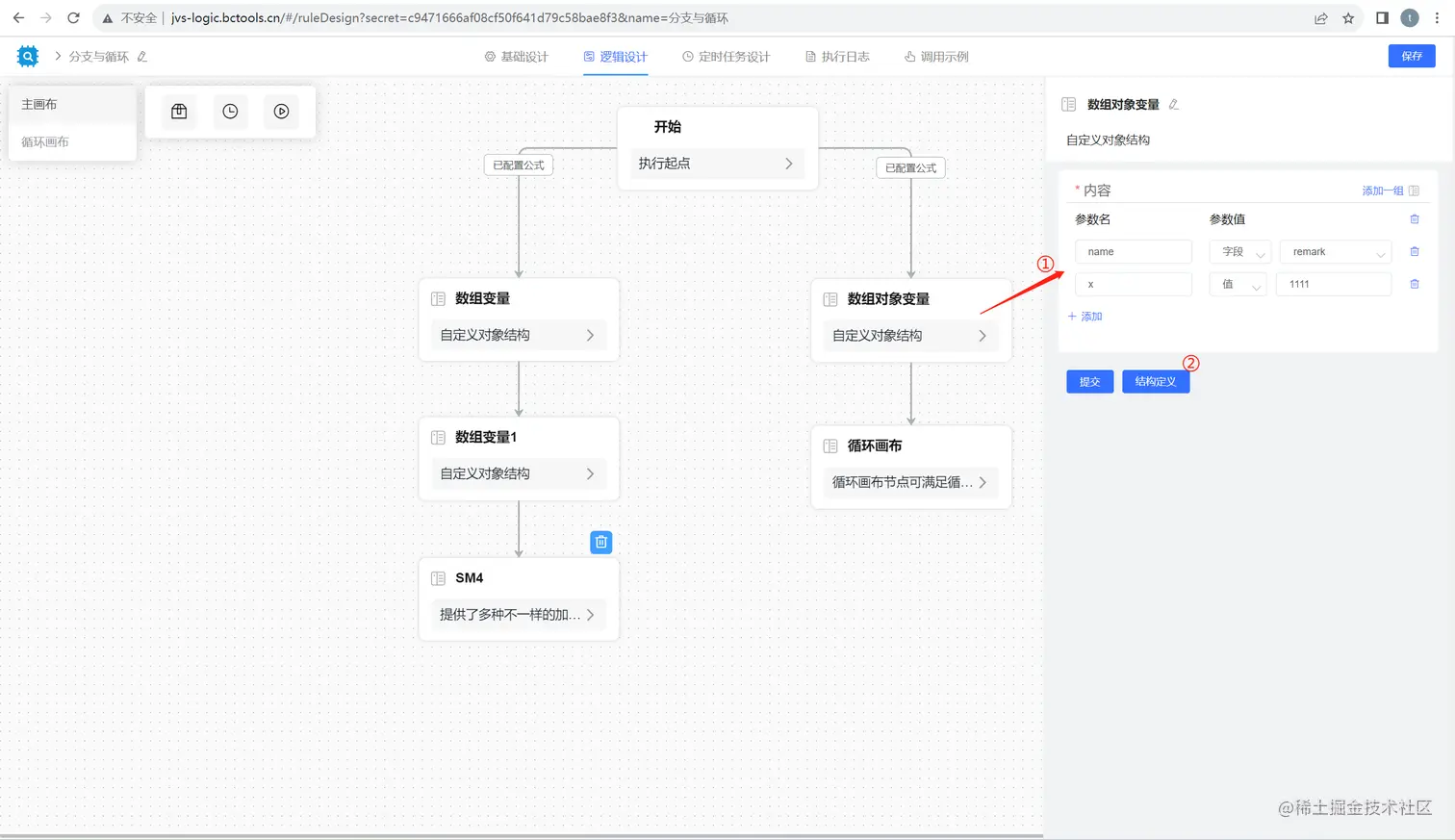①:属性设置面板,这里主要是设置输入参数,每个组件的面板输入不同