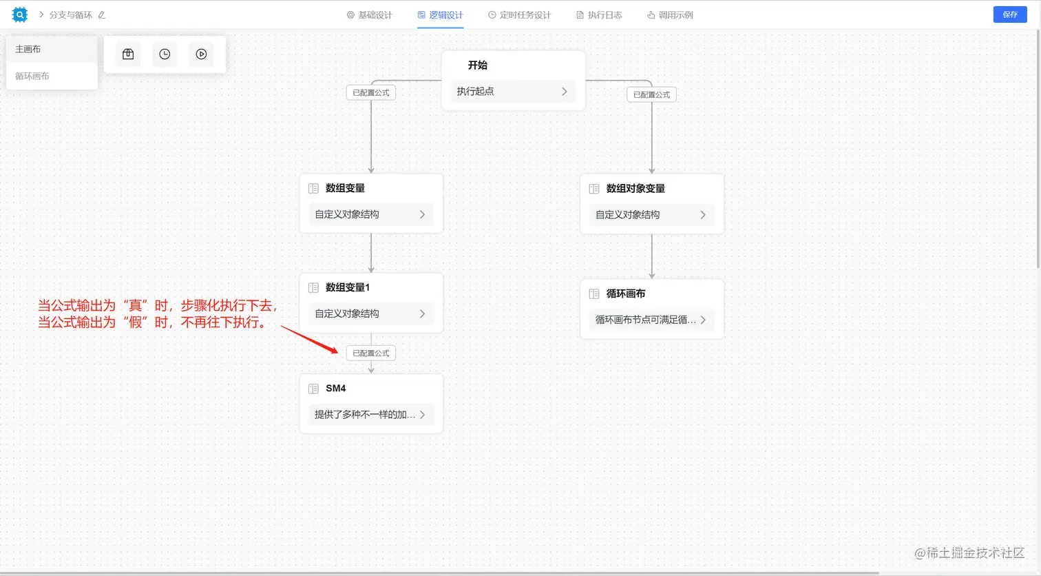 原子组件之间通过执行线进行连接,可以在线条上设置判断执行的公式,那么表示当公式执行输出结果为真或者公式内容为空时,线条执行,也就表示根据线条指向逐步执行,当线条上的公式为“假”时,该线条不执行,那么节点不在依次执行下去。