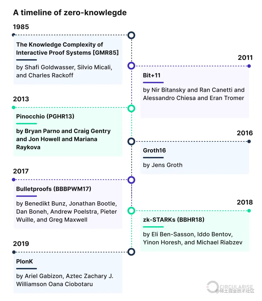 zk-SNARK(Succinct Non-Interactive Arguments of Knowledge) 可能是最流行的零知识证明形式,最早出现在 2011 年的 Bit+11 论文中。到 2013 年,多亏了 Pinocchio PHGR13 论文,零知识证明可以在现实应用中使用,该论文使 zk-SNARKS 适用于一般计算,尽管速度较慢。2016 年提出的 Groth16 算法大大降低了计算复杂性,使 zk-SNARKS 非常高效,至今仍然是标准。