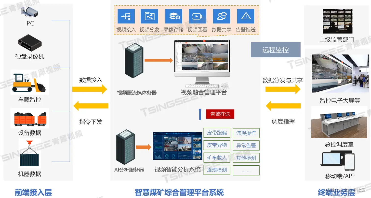 TSINGSEE青犀智能视频分析系统与视频汇聚管理系统,可以结合先进安全态势感知技术以及视频数据上云安全管理模式,实现了矿山综合管理平台全面的主动安全管理能力。结合AI视频智能分析系统,实现整体信息化终端的全面智慧化管理能力,实现了矿山生产信息化安全的可控、可防、提前风险预警等技术手段。