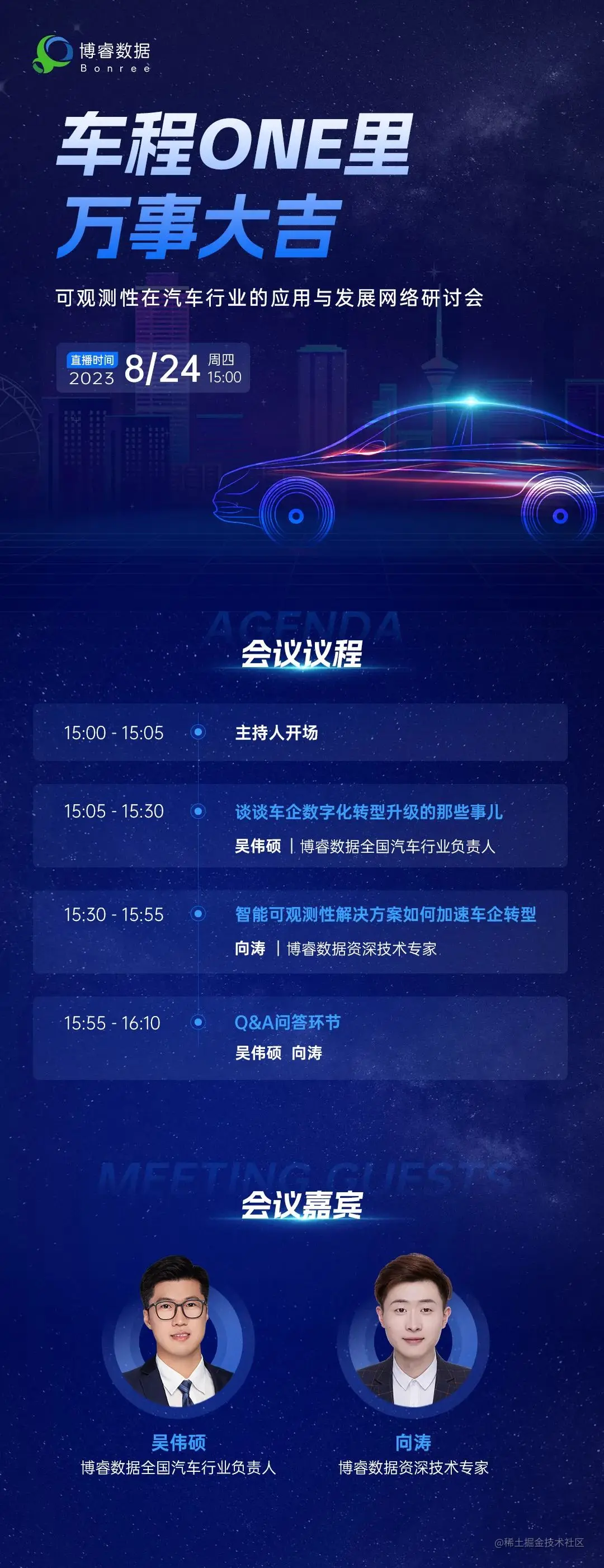 8月24日,博睿数据主办的《"车程ONE里,万事大吉" - 可观测性在汽车行业的应用与发展网络分享会》开播,邀请了博睿数据全国汽车行业负责人吴伟硕和博睿数据资深技术专家向涛做客直播间,分享汽车企业数字化转型的故事,探讨可观测性如何帮助企业应对新技术带来的运维压力,实现降本增效?