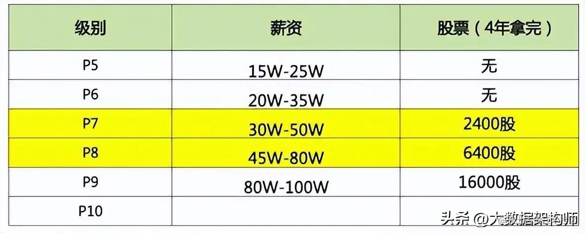 从图上可以看出来,P7是技术专家,薪资在30W-50W,但是股票给到2400股,在大环境不好的情况下,还能给到这么高的薪水着实不错了。