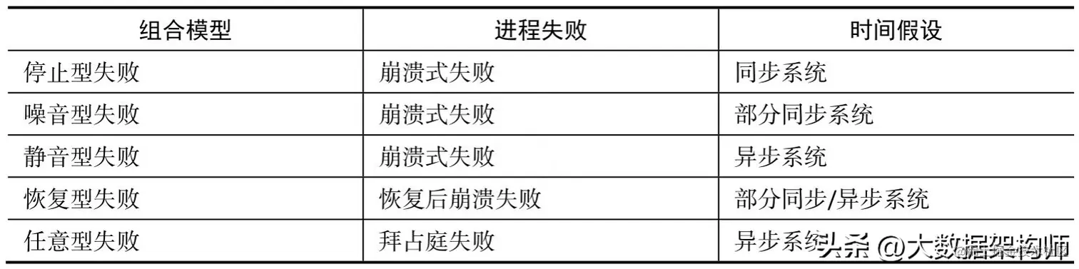 值得注意的是,停止型失败、噪音型失败、静音型失败、恢复型失败和任意型失败指的是进程失败和时间假设所组成的组合模型,而3.4节介绍的崩溃式失败、遗漏式失败、恢复后崩溃失败和拜占庭失败仅仅指进程失败的种类,请注意区分。
