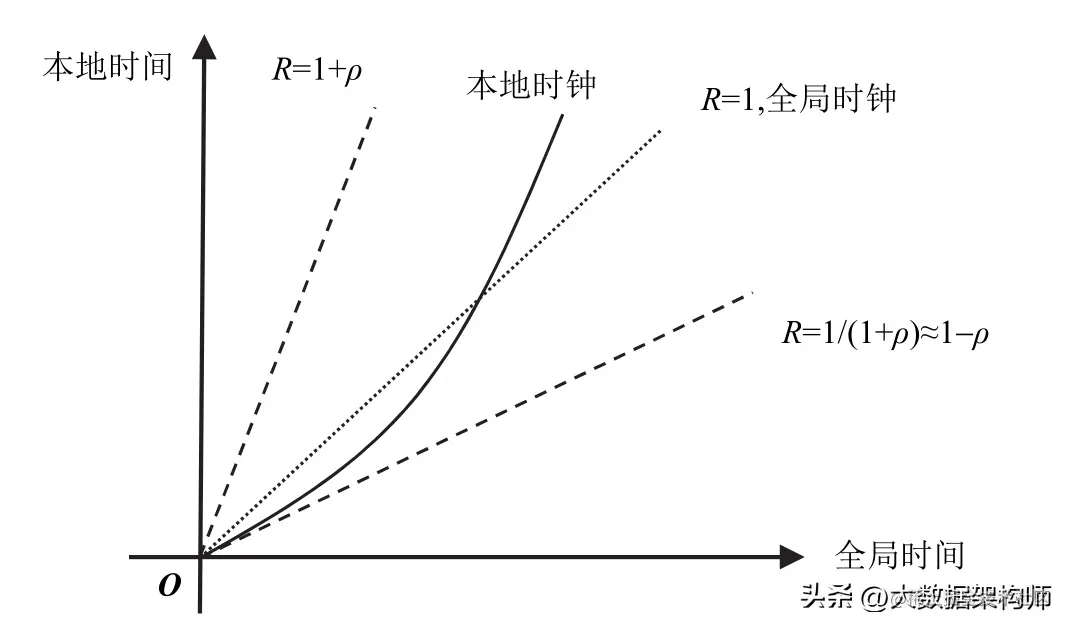 在理想情况下,时钟频率R=1,即本地时钟前进的速度与全局时钟完全相同,本地时间与全局时间的差值在任何时候都是恒定的。当R>1时,本地时钟就会快于全局时钟,反之则慢于全局时钟。这种由时钟频率导致的本地时间与全局时间的偏差就称为时钟偏移(Clock Drift)。
