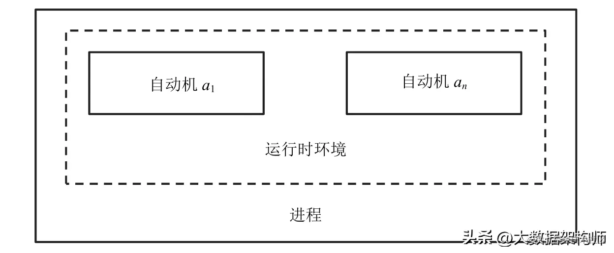 进程的构成如图 3-1 所示。进程内部有一个运行时环境,它先于任何自动机实例启动,为自动机实例提供了一个托管环境,包括定时器、底层物理链路抽象等。同时,运行时环境还负责自动机实例的生命周期管理,包括创建、恢复、销毁自动机实例等。