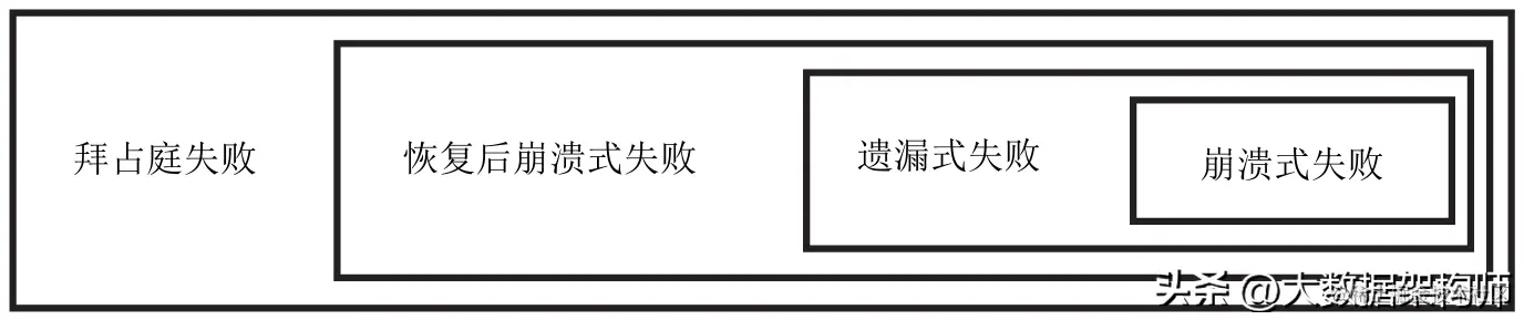 进程失败可以被分为四种,分别是崩溃式失败、遗漏式失败、恢复后崩溃失败和拜占庭失败,它们的关系如图3-2所示。其中,崩溃式失败可以看作一种特殊的、即遗漏发生后不会恢复的遗漏式失败;遗漏式失败可以看作恢复后崩溃失败的特例,即一种不失忆的恢复;恢复后崩溃失败可以看作拜占庭失败的特例,即没有进程、不按照预设的算法执行的、特殊的拜占庭失败。
