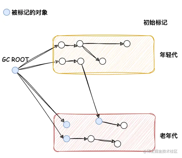 这一步仍然需要暂停所有的其他线程,但这个阶段会很快完成。它的目的是「标记所有的根对象,以及被根对象直接引用的对象,以及年轻代指向老年代的对象」。