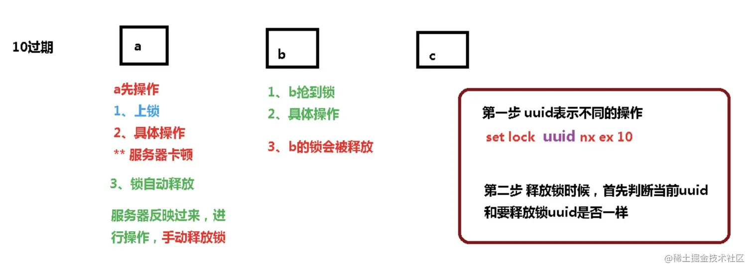 - 解铃还须系铃人。 加锁和解锁必须是同一个客户端,客户端自己不能把别人加的锁给解了。