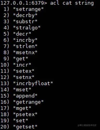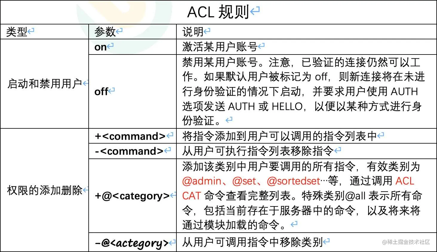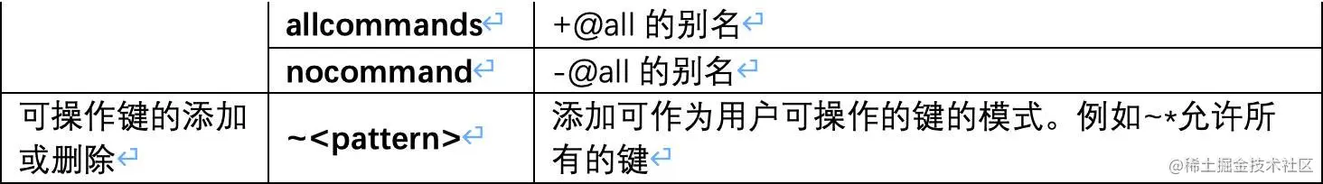 下面是有效ACL规则的列表。某些规则只是用于激活或删除标志,或对用户ACL执行给定更改的单个单词。其他规则是字符前缀,它们与命令或类别名称、键模式等连接在一起。
