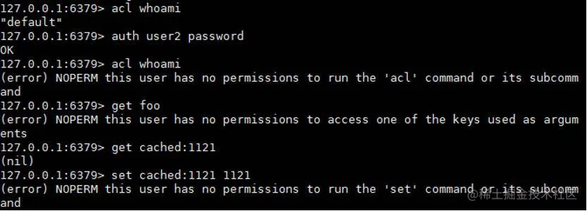 acl setuser user2 on >password ~cached:* +get - 切换用户,验证权限