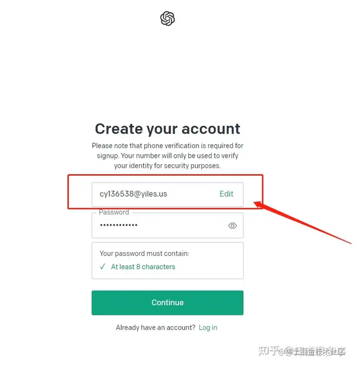1.在Openai注册页面填入邮箱账号并设置密码.然后点击continue