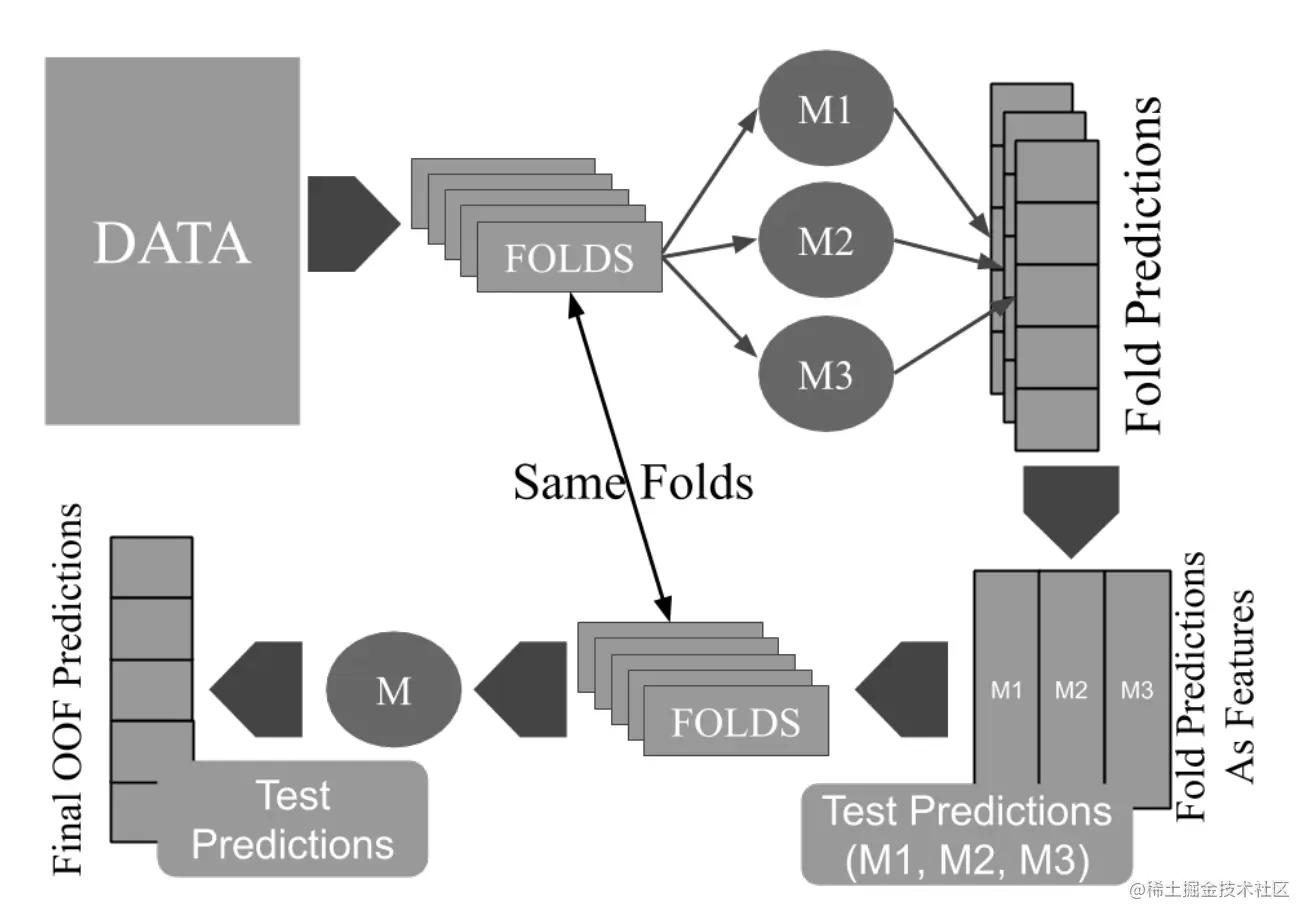 有时候会看到术语 Blending 混合,该术语仅仅替换了 Fold 创建方法,使用 hold out fold 的方法做 L1 模型训练,即留出某些 Fold 不参与训练,只参与测试。