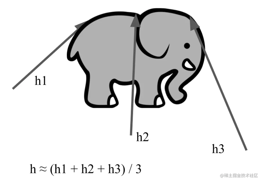 上图显示了三个人猜测大象的高度,真实高度更接近三个猜测值的平均值。假设每个人都猜的很准,那么平均三个人的猜测结果会更准。当然,平均过程也可以加权计算。