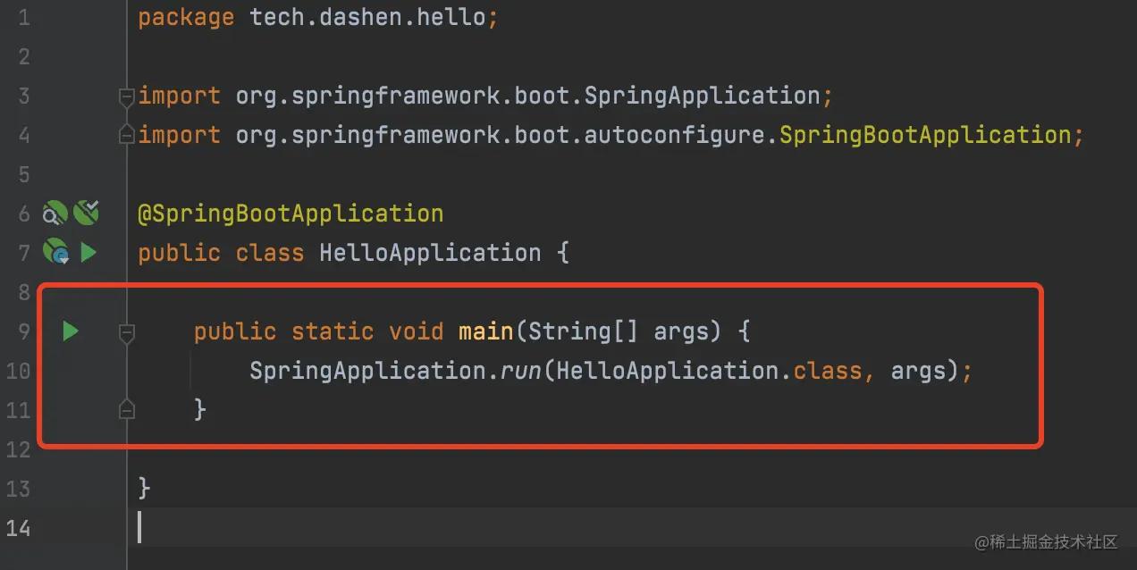 展开项目,此时会有一个以 项目名+Application 命名的java类,里面有main方法,这就是程序入口,run它就类似启动tomcat,表示项目启动了;