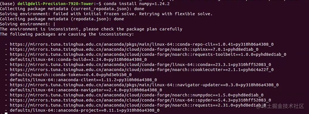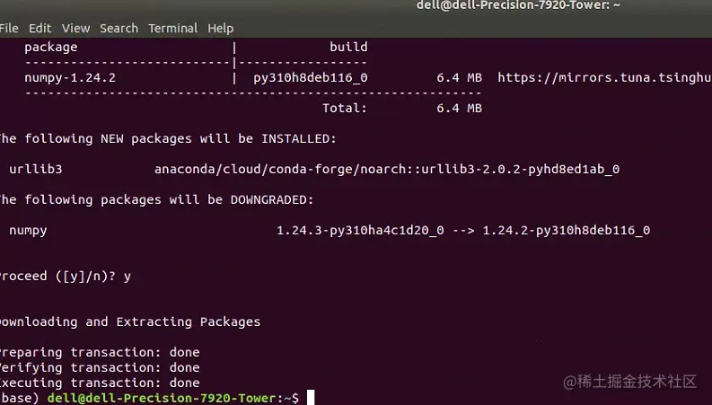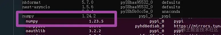 随后,进一步发现,Ubuntu平台中numpy库的下载来源是pypi,而我此时用的是Anaconda环境;因此,考虑重新用conda安装一下numpy库。这里我们输入如下的代码。