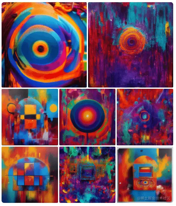 在蒸馏模型上进行 LoRA 训练的一个优点是训练更快。下面是我们在蒸馏模型上对一些抽象概念进行的第一个 LoRA 训练的一些图像。LoRA 训练的代码可以在 这里 找到。