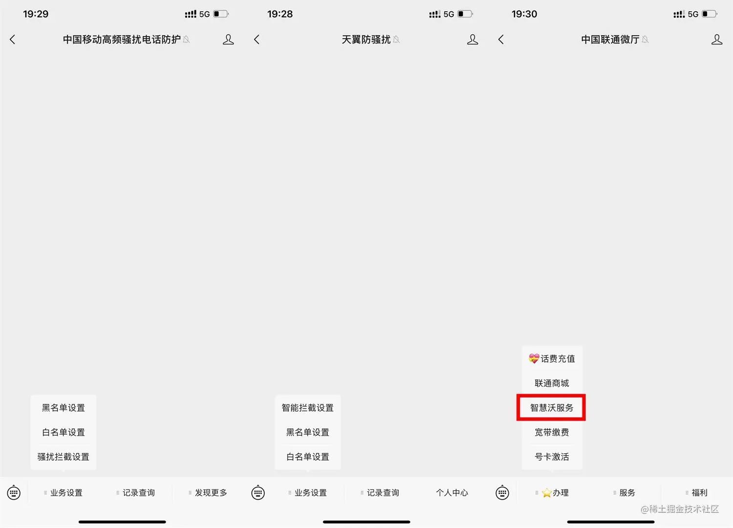三网用户免费开通电话防骚扰 BUG开拓者 2023-08-29 279 阅读1分钟 移动用户:公众号“中国移动高频骚扰电话防护”点击菜单栏“业务设置”开启。 电信用户:公众号“天翼防骚扰”点击菜单栏“业务设置”开启。 联通用户:公众号“中国联通微厅”点击菜单栏“智慧沃服务”下拉到最底下开启。