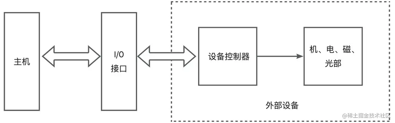 包括设备控制器和机、电、磁、光部分。设备通过I/0接口和主机通信,主机通过I/0接口进行设备控制