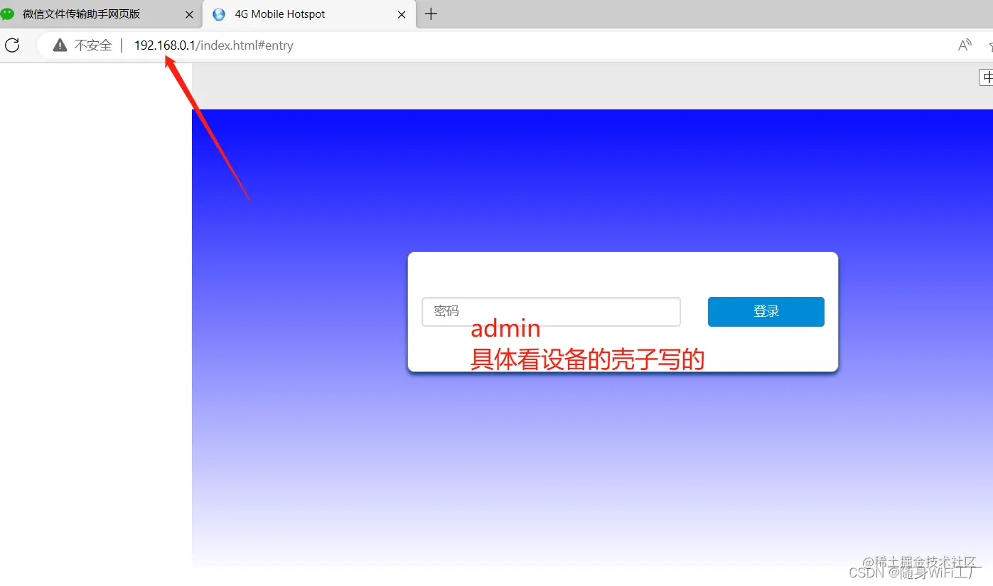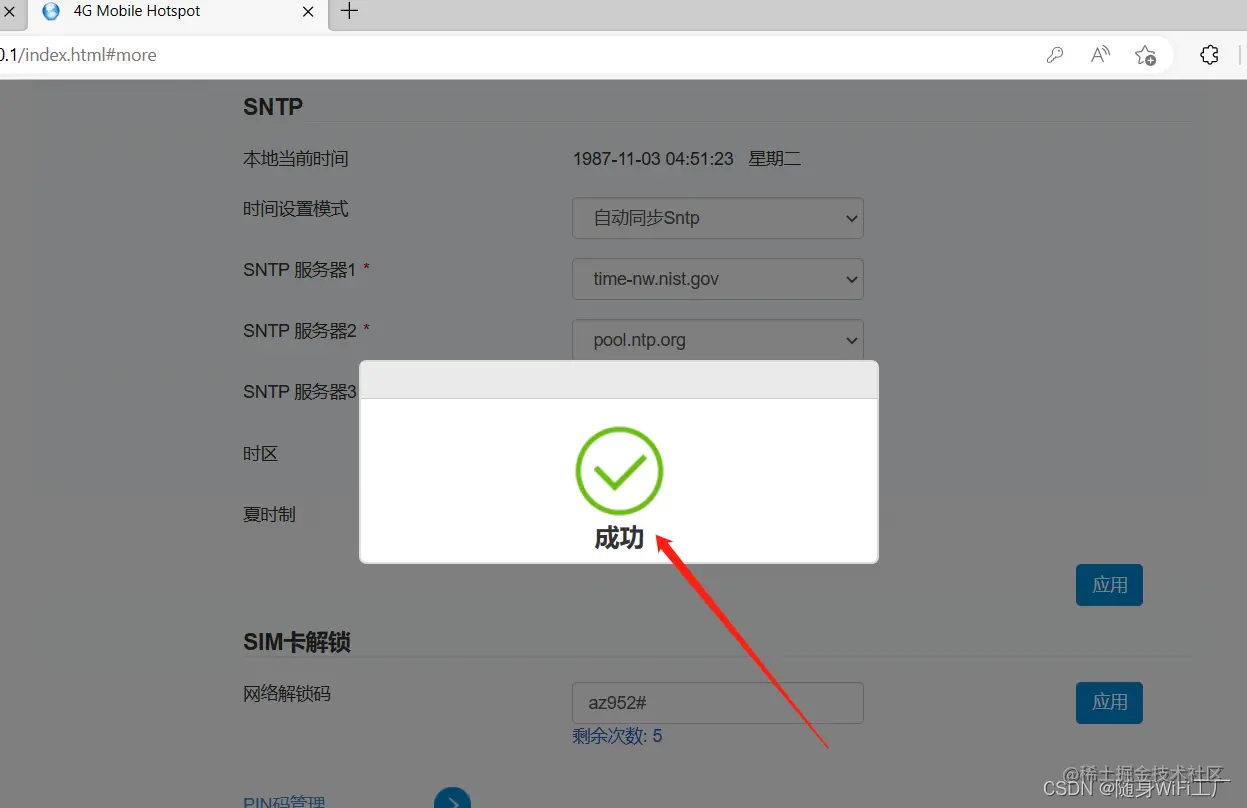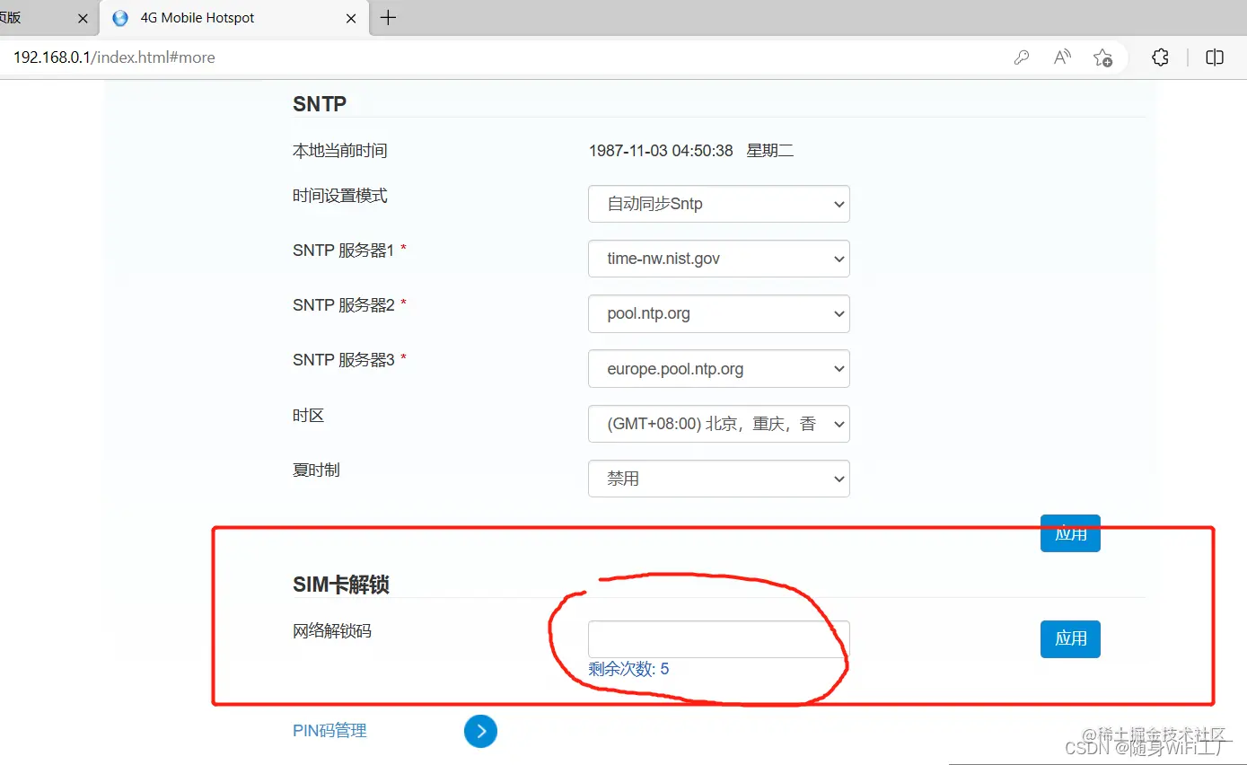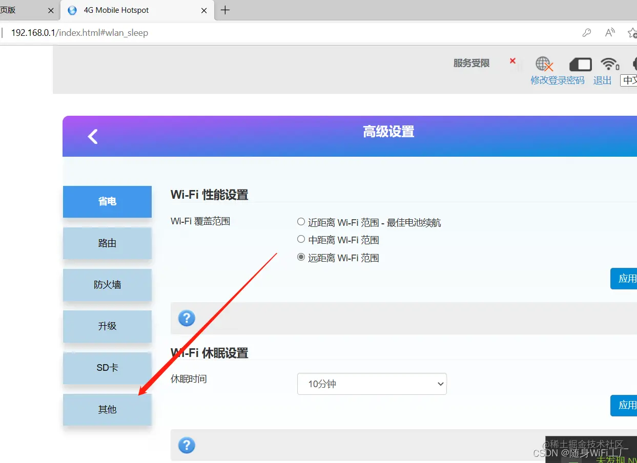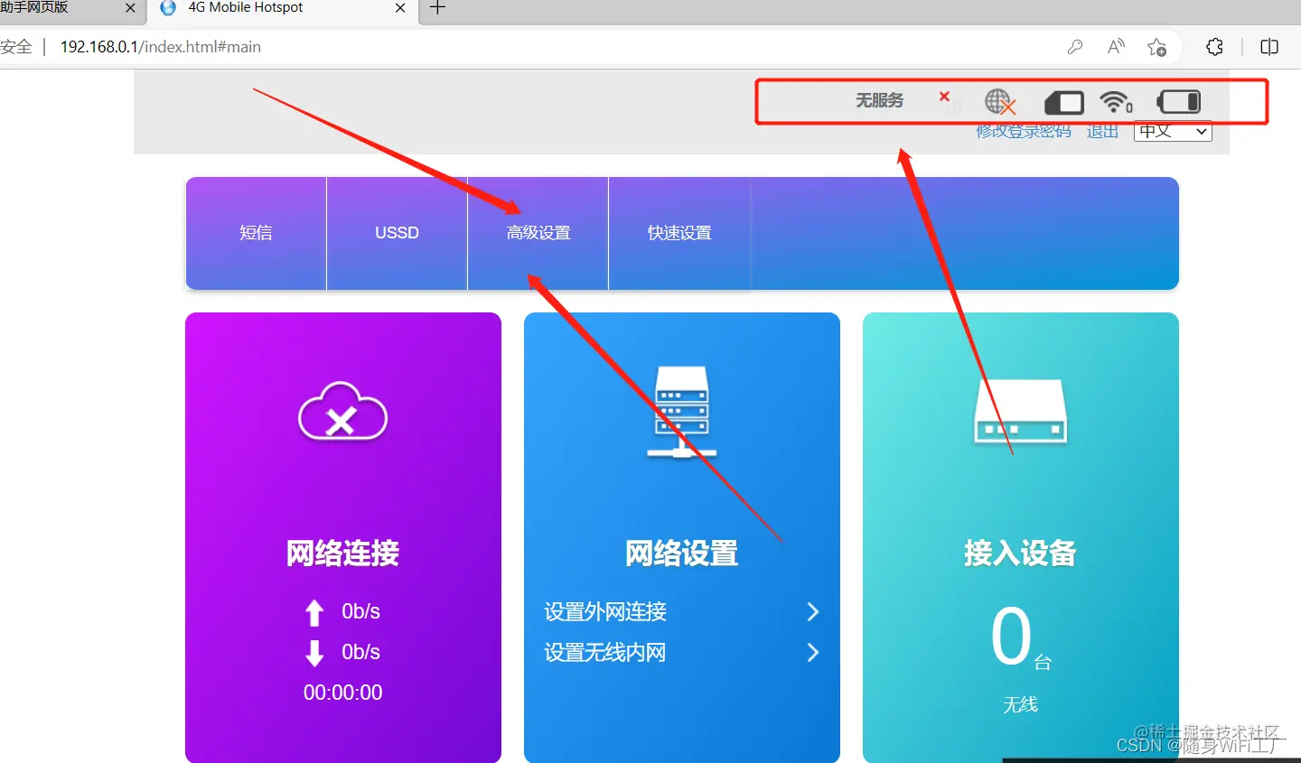 随身WiFi解锁卡槽用自己卡上网教程,适用于中兴微的随身WiFi BUG开拓者 2023-08-29 1,702 阅读1分钟 首先 要有一个棒子 确保是中兴微芯片的 把后盖拆开 就能看到卡槽 如果你的设备 插卡直接能用 就不用看了 或者自己学学看 把自己的卡正确方向安装进去 盖好锁盖 直接通电 不知道 网关IP的话 自行去ping 下 或者看壳子 打开IP 登录 密码壳子上有 进去 点高级 检查 再点 其他 往下滑 看到SIM卡解锁 通用密码是az952# 点应用 点 是 等着 自动重启 起来后 就看到是这样 可以用自己卡了
