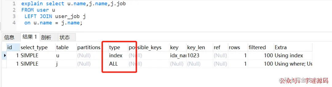 执行左外连接查询,user_job表还是走全表扫描,如下: