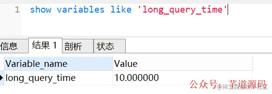 我们还可以使用show variables like 'long_query_time'命令,查看超过多少时间,才记录到慢查询日志,如下: