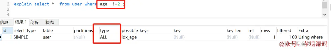 虽然age加了索引,但是使用了!= 或者< >,not in这些时,索引如同虚设。如下: