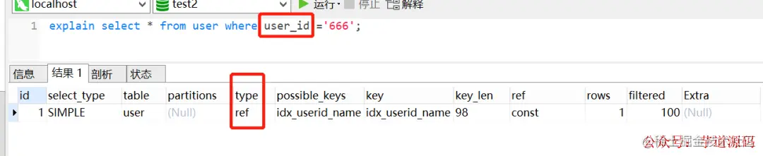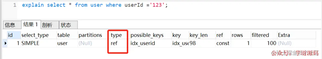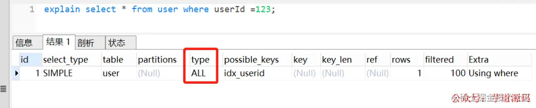 userId字段为字串类型,是B+树的普通索引,如果查询条件传了一个数字过去,会导致索引失效。如下:
