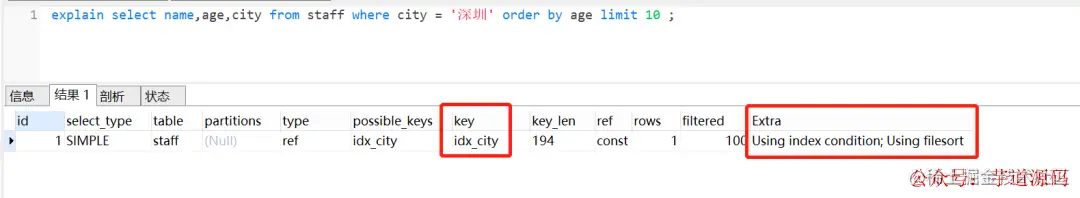 - Extra 这个字段的Using filesort表示使用了文件排序