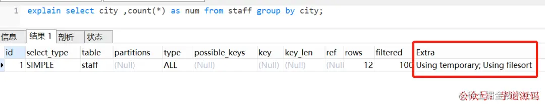 - Extra 这个字段的Using temporary表示在执行分组的时候使用了临时表