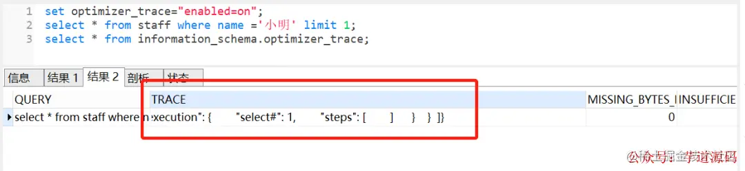 我们可以使用set optimizer_trace="enabled=on"打开开关,接着执行要跟踪的SQL,最后执行select * from information_schema.optimizer_trace跟踪,如下: