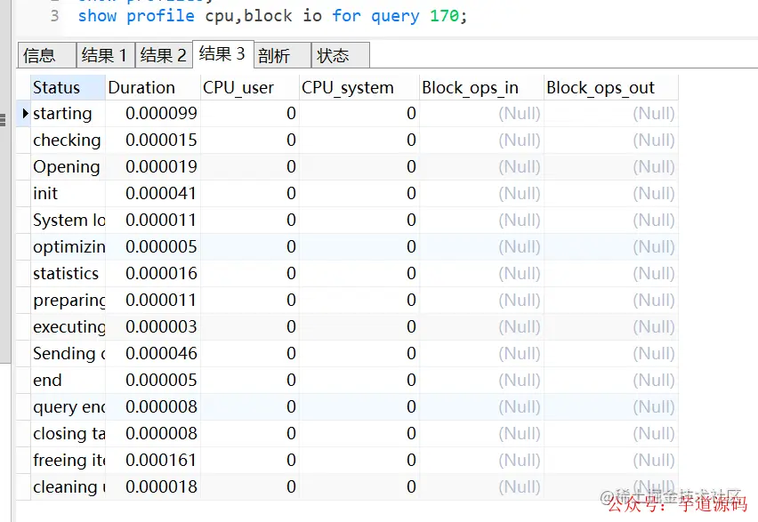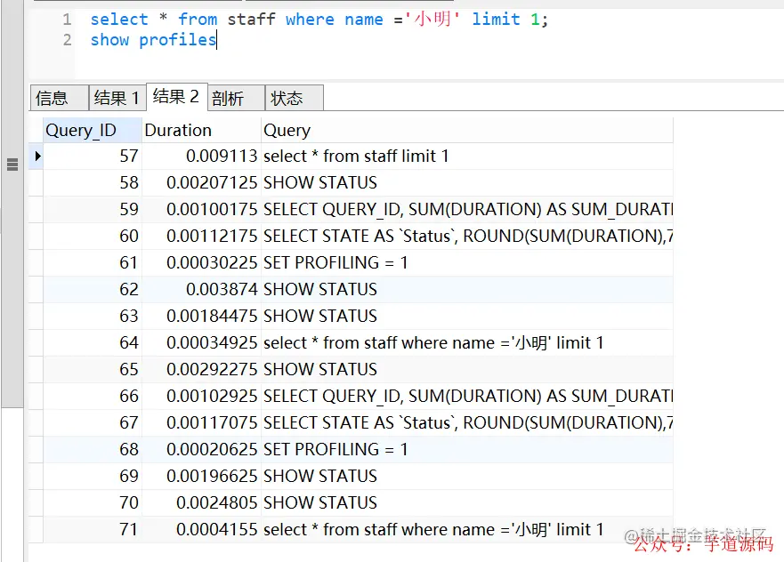 show profiles会显示最近发给服务器的多条语句,条数由变量profiling_history_size定义,默认是15。如果我们需要看单独某条SQL的分析,可以show profile查看最近一条SQL的分析,也可以使用show profile for query id(其中id就是show profiles中的QUERY_ID)查看具体一条的SQL语句分析。