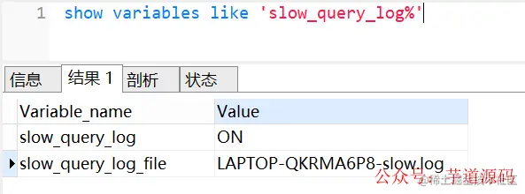 查看下慢查询日志配置,我们可以使用show variables like 'slow_query_log%'命令,如下: