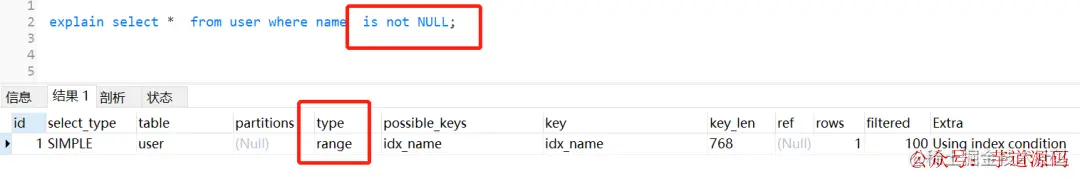 单个name字段加上索引,并查询name为非空的语句,其实会走索引的,如下: