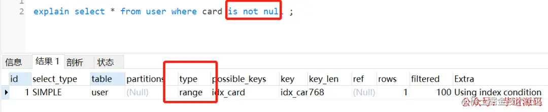 单个card字段加上索引,并查询name为非空的语句,其实会走索引的,如下: