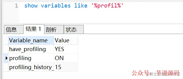 profiling默认是关闭,我们可以使用show variables like '%profil%'查看是否开启,如下: