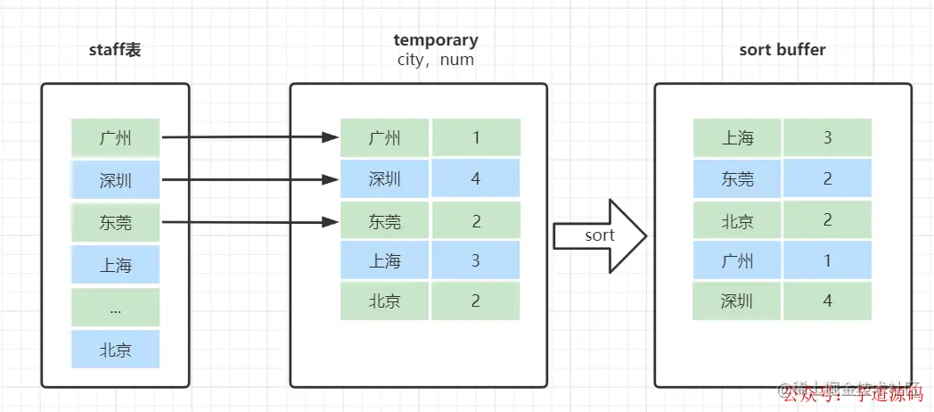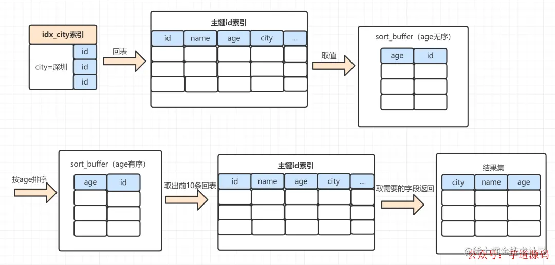 - 遍历完成后,再根据字段city做排序,得到结果集返回给客户端。这个流程的执行图如下: