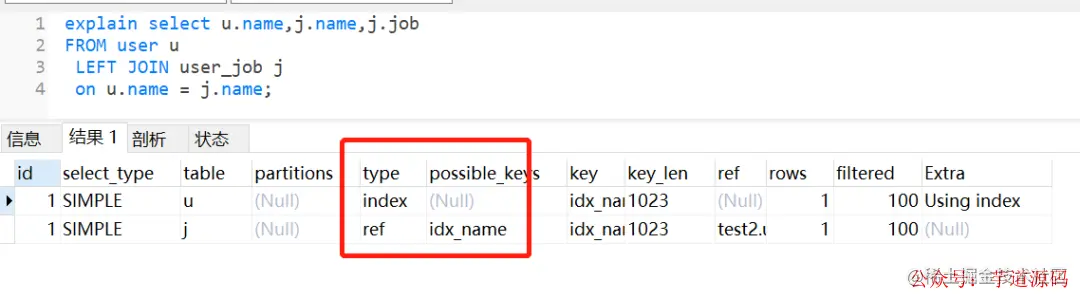 如果把它们的name字段改为编码一致,相同的SQL,还是会走索引。