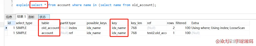 MySQL版本是5.7,假设当前有两张表account和old_account,表结构如下: