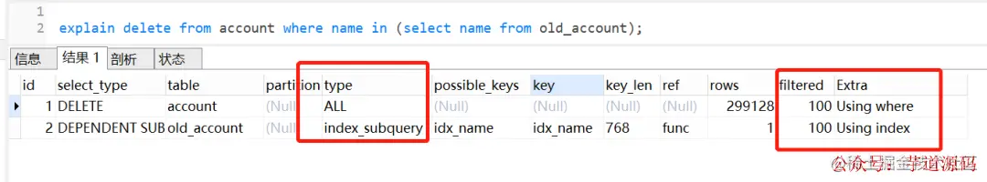 之前见到过一个生产慢SQL问题,当delete遇到in子查询时,即使有索引,也是不走索引的。而对应的select + in子查询,却可以走索引。