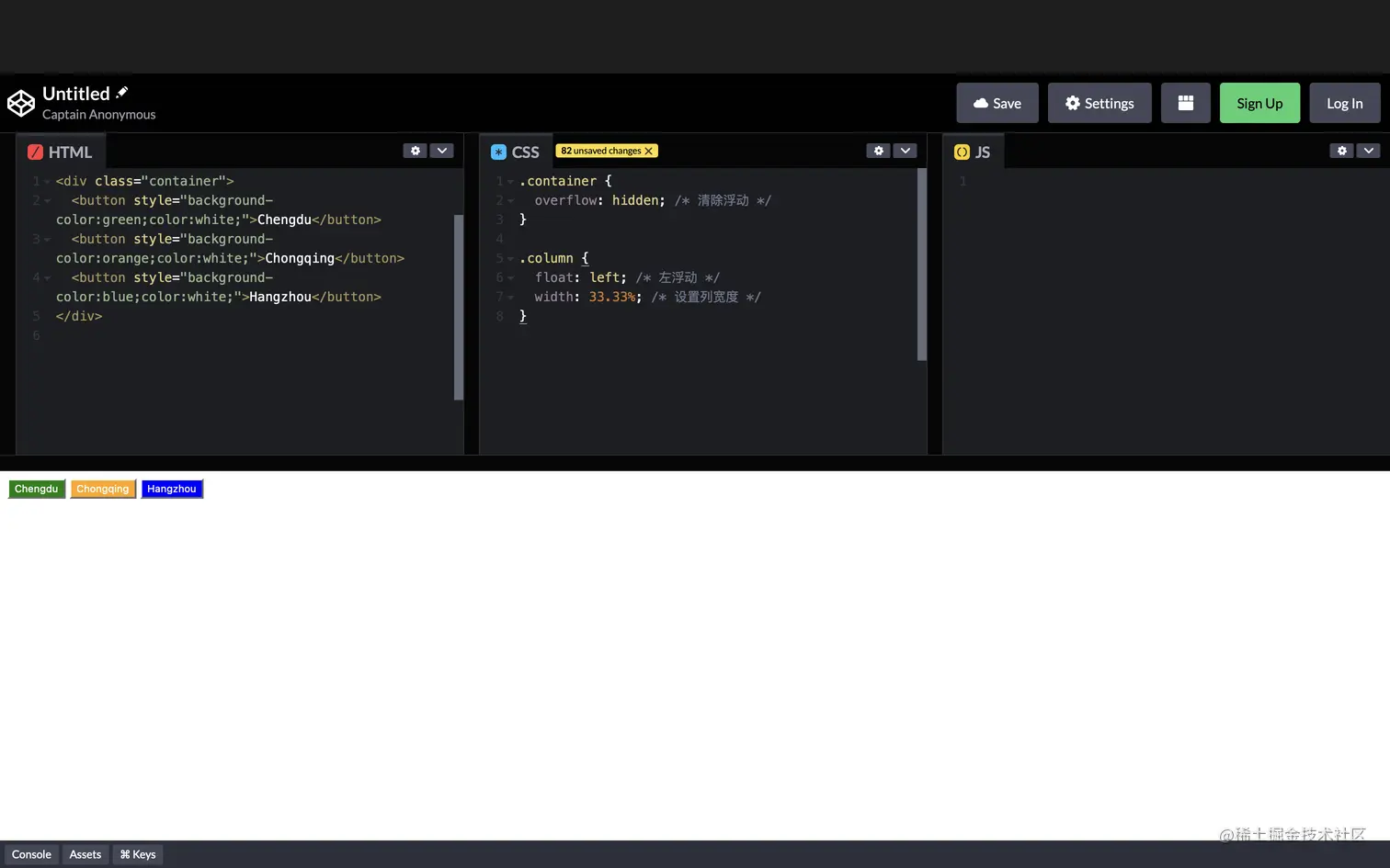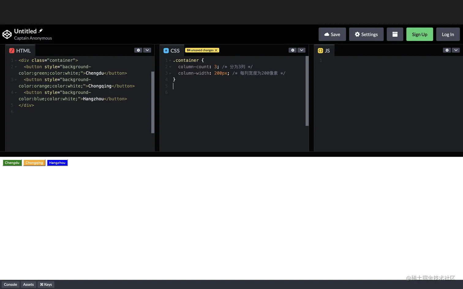 .container类使用column-count: 3;属性将内容分为三列。 -