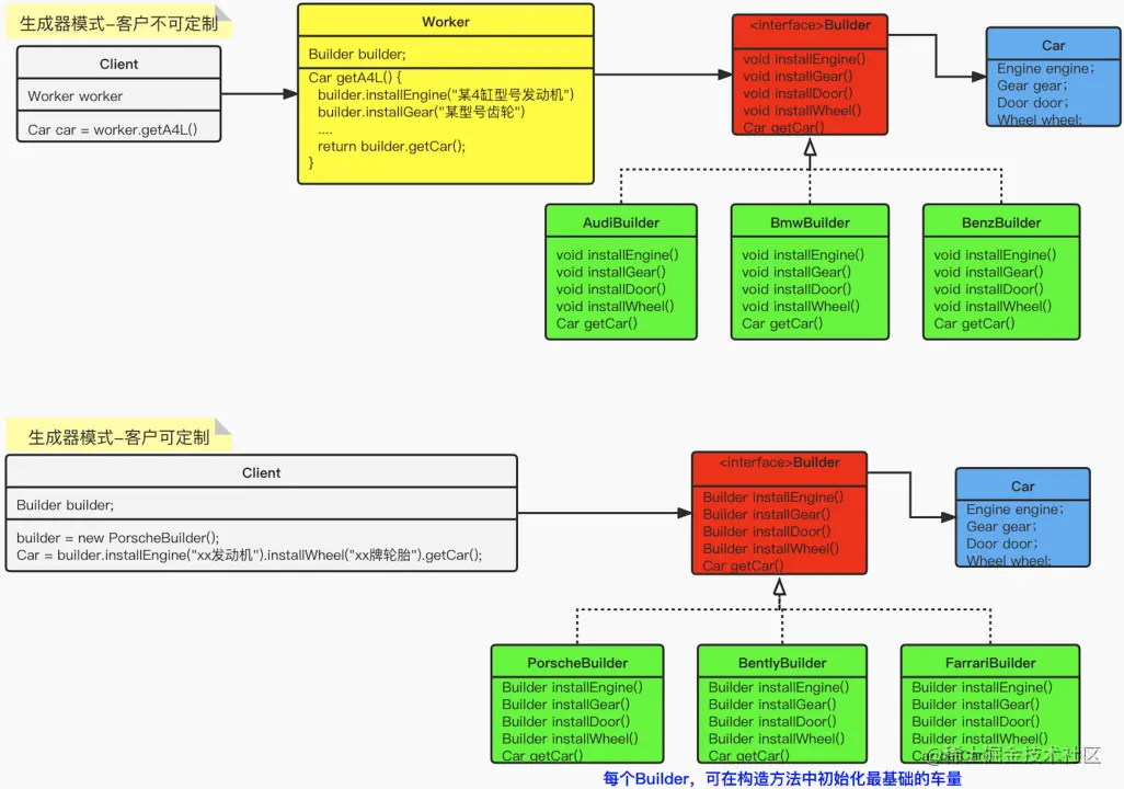 在通过上面的例子了解了建造者模式之后,我们就通过类图的方式,展示一下该模式。在下图中,我们提供了两种场景:分别是客户不可定制和客户可以定制,具体选择哪种实现方式,可以根据具体的业务场景来自行选择: