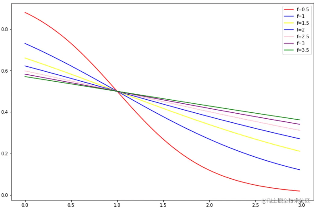 ② f:平滑因子,控制权重函数在拐点处的斜率,f越大,曲线坡度越缓。下面是k=1时,不同f对于权重函数的影响: