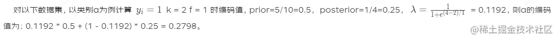 平均数编码,有些地方也称之为目标编码(Target Encoding),是一种基于目标变量统计(Target Statistics)的有监督编码方式。该方法基于贝叶斯思想,用先验概率和后验概率的加权平均值作为类别特征值的编码值,适用于分类和回归场景。平均数编码的公式如下所示: